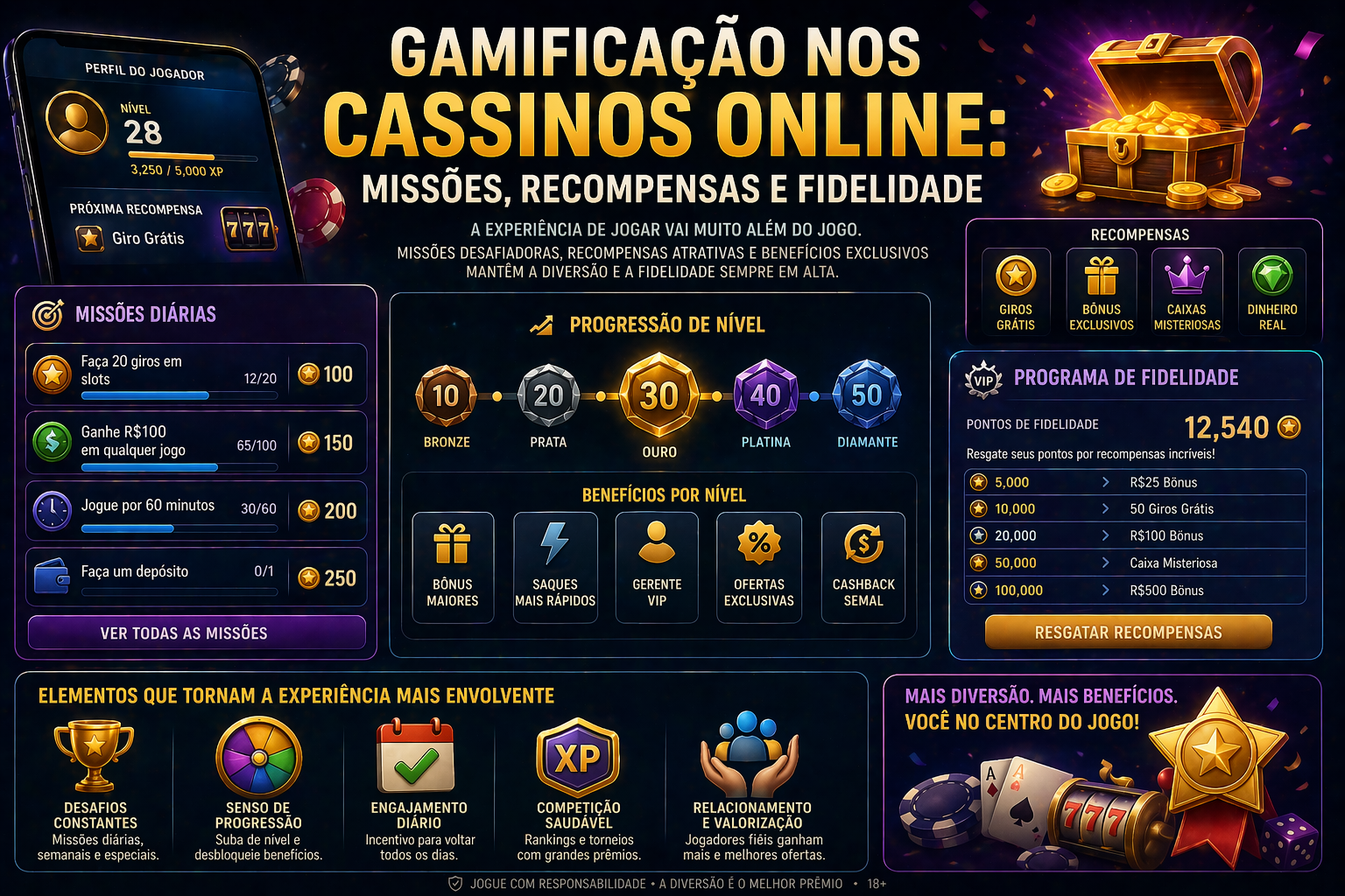 | Incentivo ao retorno | Promoções e novos jogos | Missões diárias, progresso e recompensas frequentes |